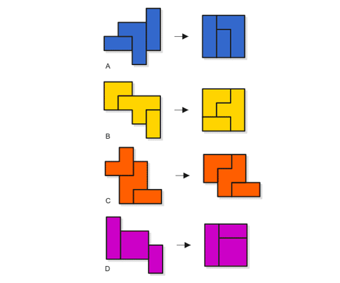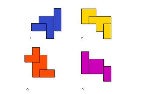 Jeżeli przestawi się części każdej kompozycji pokazanych poniżej – to trzy kompozycje będą miały identyczny kształt, a jedna nie. Która to będzie kompozycja?