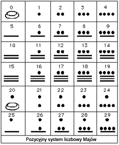 Najbardziej interesujący dla nas jest okres klasyczny Majów, czyli od 250 do 900 r. n.e., z tym że cywilizacja ta początek swój bierze od ok. roku 2000 r. p.n.e. Majowie w tym okresie zbudowali duże miasta – ok. 15 ich odkryto na półwyspie Jukatan. Miasto Tikál liczyło aż 50 tys. mieszkańców, 3 tys. samodzielnych budynków, włącznie z pałacami, świątyniami, grobami świętych, domami, tarasami, groblami, placami i olbrzymimi zbiornikami do przechowywania wody deszczowej. Władcami byli kapłani astronomowie, którzy kontrolowali ludność dzięki religijnym rytuałom. Rolnictwo, wraz z rozbudowanymi systemami irygacyjnymi, stało na wysokim poziomie. Ważną rolę w społeczeństwie odgrywała astronomia i kalendarze, które wymagały znajomości matematyki. I rzeczywiście, Majowie opracowali bardzo wyrafinowany system liczbowy. Na owe czasy był to najbardziej zaawansowany system na całym świecie. Pozycyjny system liczbowy Majów oparty był na systemie dwudziestkowym. Powstał najpewniej dlatego, że posługiwali się oni przy liczeniu palcami rąk oraz nóg. Mimo że był to system dwudziestkowy, widać jednak, jak ważną rolę odgrywała liczba 5. Warto zauważyć, że system ten ma tylko trzy symbole liczbowe (prawdopodobnie w czasie liczenia symbol jedności stanowił kamyk, symbol liniowy był patykiem, a zero muszlą).