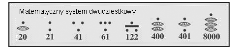 Pozycyjny system liczbowy Majów był systemem dwudziestkowym. Nasz system dziesiętny dzieli się na pozycje: 1, 10, 100, 1000, 10000 itd., a system Majów na pozycje: 1, 20, 400, 8000, 16000 itd. W systemie dziesiętnym istnieje dziesięć możliwych cyfr dla każdej pozycji liczbowej [0 – 9]; w systemie Majów istnieje ich 20 [0-19]. Np. w systemie dziesiętnym 31 = 10 x 3 + 1, natomiast u Majów 31 = 20 + 11. Majowie odkryli i używali liczby zero. |