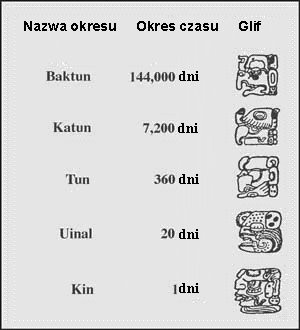 Majowie nie posiadali metody mnożenia i dzielenia liczb, jednakże ich system liczbowy pozwalał na wykonywanie tych operacji. Jak wspomnieliśmy, Majowie mieli ustaloną stałą datę, tzw. data zero, inicjującą kalkulacje kalendarzowe. Data ta to 4 Ahau 8 Kumk, która w kalendarzu gregoriańskim odpowiada 13 sierpnia 3113 p.n.e. Dni były pogrupowane na okresy podobnie jak nasze lata na wieki. Każdy okres miał specyficzny glif i nazwę: |