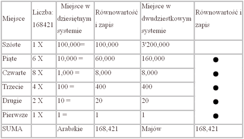 | Pozycje liczbowe w dwudziestkowym pozycyjnym systemie Majów rosną odpowiednio pomnożone przez 20. Dla porównania liczba 168 421 w obu systemach liczbowych: |