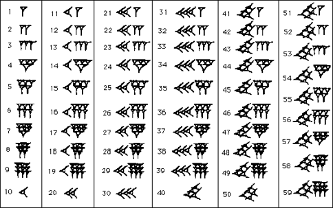 Czytamy tę liczbę od lewej do prawej strony. System Babilończyków zbudowany jest w podobnej konwencji - pozycja położona najbardziej na prawo przeznaczona jest dla liczb od 1 do 59. Jeśli przyjmiemy teraz symbole systemu sześć - dziesiątkowego, w którym liczby oddzielone są przecinkami, np.: 1,57,46,40, to liczba będzie wyglądać następująco: