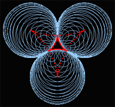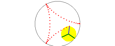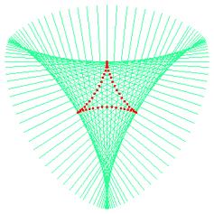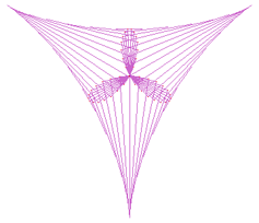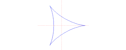 Hipocykloida to linia, jaką opisuje ustalony punkt okręgu toczącego się bez poślizgu wewnątrz okręgu o większym promieniu. Jeżeli stosunek promienia R dużego okręgu do promienia r małego okręgu wynosi 3, to otrzymujemy deltoidę. R/r = 3. |