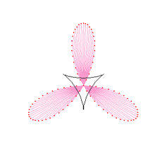 Deltoida i jego styczne U dołu po lewej - ewoluta utworzona przez obwiednię normalnych/prostopadłych