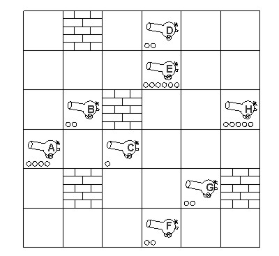 Na planszy znajduje się osiem armat. Obok każdej z nich jest kilka kul. Zadanie polega na zbombardowaniu wszystkich białych pól planszy przy zachowaniu następujących warunków: