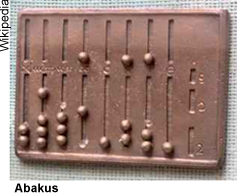 Niewątpliwie pierwszym takim wynalazkiem był abakus (abak), używany przez starożytnych Egipcjan, Greków i Rzymian. Była to początkowo deska pokryta piaskiem, na której przeciągnięte zostały równoległe rysy. W utworzonych w ten sposób polach umieszczano kamienie: w pierwszej kolumnie oznaczały one jedności, w drugiej dziesiątki, w trzeciej setki, w czwartej tysiące itd. Później wygląd abakusów się zmieniał, jednak zasady posługiwania się nim były bardzo podobne. |