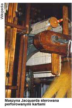 | Przełom w rozwoju maszyn liczących nastąpił w 1801 roku, gdy na wystawie w Paryżu pokazany został wynalazek tkacza francuskiego Josepha-Marie Jacquarda. Użył on do sterowania krosnem tkackim kart dziurkowanych z zakodowanym wzorem, który miał być tkany. Zapoczątkował tym samym automatyzację procesu przetwarzania danych. W późniejszych latach perforowane karty Jacquarda zostały zastosowane m.in. do zapisywania muzyki odgrywanej za ich pomocą przez automatyczne pianina oraz do przechowywania programów komputerowych. |