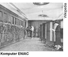 | 1946 rok – to data zbudowania pierwszej na świecie maszyny cyfrowej z zastosowaniem techniki elektronicznej, do jej budowy użyto 18 tysięcy lamp elektronowych. ENIAC (Electronic Numerical Integrator and Computer) został skonstruowany przez Amerykanów Johna Mauchly'ego i Johna Eckerta. Pamięć maszyny mieściła 20 liczb 10-cyfrowych, a szybkość pracy wynosiła 5 tysięcy operacji dodawania na 1 s i 300-500 operacji mnożenia na 1 s. Urządzenie ważyło 15 ton i miało wymiary 15 na 9 metrów. Od tego momentu zacznają powstawać nowe komputery (EDVAC, EDSAC, UNIVAC), które korzystają z doświadczeń przy projektowaniu ENIAC-a. Szczególne znaczenie przy ich budowie miały prace amerykańskiego matematyka pochodzenia węgierskiego Johanna von Neumanna. |