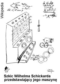 XVII wiek przyniósł również pierwsze mechaniczne urządzenia obliczeniowe. Prekursorem w tej dziedzinie był niemiecki astronom i matematyk Wilhelm Schickard. W 1623 roku zbudował on z drewna czterodziałaniową maszynę liczącą. Maszyna ta nazywana była również zegarem liczącym, wykorzystywała bowiem mechanizmy zegarowe – tryby, koła, których ruchy są od siebie wzajemnie uzależnione. Pełny obrót koła o nominałach od 0 do 9 powodował mechaniczne przesunięcie się koła zawierającego jednostki wyższego rzędu (dziesiątki) o 1 itd. Na podobnej zasadzie działały także inne ówczesne maszyny liczące. Do obecnych czasów nie zachował jedyny wykonany egzemplarz maszyny Schickarda, |