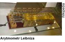 który spłonął w 1624 roku. W 1960 roku próbowano ją odtworzyć na podstawie opisów i szkicu zawartych w listach Schickarda do wybitnego astronoma Johannesa Keplera. Nieco później – w 1642 roku Blaise Pascal zbudował dwudziałaniową (dodawanie i odejmowanie) maszynę arytmetyczną. Miała ona ułatwić obliczanie podatków jego ojcu, który był królewskim radcą podatkowym. W sumie powstało 16 takich maszyn. 30 lat później natomiast Gottfried Wilhelm Leibniz, idąc śladami Pascala, zbudował arytmometr, za pomocą którego można było już wykonywać cztery działania matematyczne. Skonstruował on cztery egzemplarze tego urządzenia. Do naszych czasów zachował się oryginał arytmometru Leibniza, który został odnaleziony w 1879 roku na strychu w Getyndze i obecnie przechowywany jest w muzeum Leibniza w Hanowerze. |