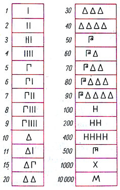 I, II, III, IIII – oznaczało 1, 2, 3, 4. Γ – oznaczało 5, ponieważ gente po ateńsku znaczy 5. Δ – oznaczała 10, ponieważ deka po grecku znaczy 10. Η – oznaczało 100, ponieważ hekaton znaczy 100. Χ – oznaczało 1000, ponieważ chilioi znaczy 1000. Μ – oznaczało 10 000, ponieważ myrias znaczy 10 000.