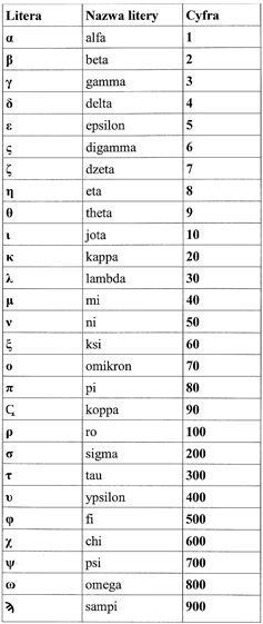 Inaczej przedstawiał się joński system cyfrowy, pochodzący z kolonii greckich w Azji Mniejszej (Milet) i Aleksandrii. Najstarszy zapis tych znaków pochodzi z Γ wieku p.n.e. Polegał on na wykorzystaniu kolejnych liter alfabetu jako cyfr, na przyporządkowaniu każdej literze alfabetu greckiego jednej cyfry. Żeby system był kompletny, do liter greckich dodano także (dla oznaczenia 6, 90 i 900) trzy litery z alfabetu semickiego. Wzajemne powiązanie liter i cyfr przedstawia tabela: |