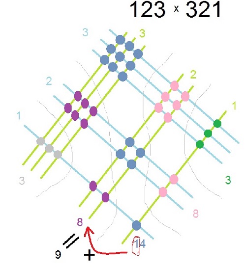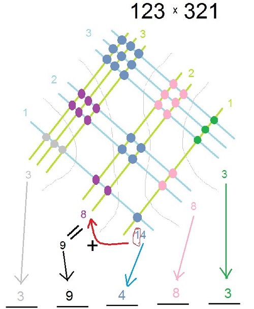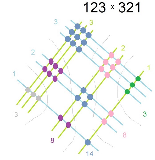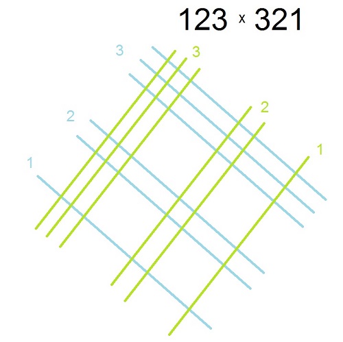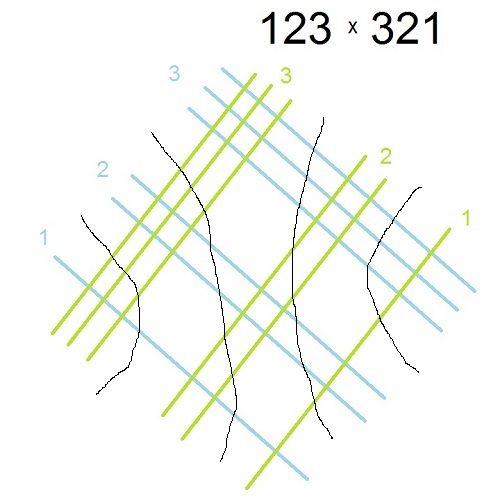Ostatnio przeglądając internet, natrafiliśmy na ciekawy sposób wykonywania mnożenia stosowany ponoć w szkołach japońskich. Przedstawimy tę metodę na przykładzie iloczynu 123 x 321. Na pierwszym rysunku przedstawiliśmy liczby w postaci narysowanych odcinków. Odcinki w kolorze niebieskim przedstawiają liczbę 123. Odcinki w kolorze zielonym liczbę 321. Zwróć uwagę, że narysowane odcinki się krzyżują. |