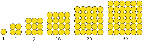 Liczba kwadratowa natomiast to każda taka liczba o numerze n, będąca na przykład liczbą kół jednakowej wielkości, z których można ułożyć kwadrat o boku zbudowanym z n kół. Graficznie liczby kwadratowe można przedstawić następująco: