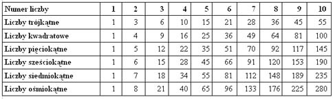 Na podobnej zasadzie jak liczby trójkątne i kwadratowe tworzone są inne liczby wielokątne. Przykłady liczb trójkątnych, kwadratowych i innych wielokątnych przedstawia tabela: