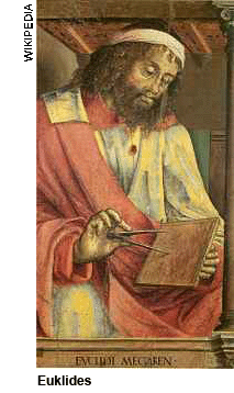 Euklides – czy żył i działał? Co do tego istnieją różne teorie. Niektórzy uważają, że w rzeczywistości Euklides to pseudonim grupy matematyków. Jednak według greckich uczonych nie ma wątpliwości co do istnienia Euklidesa. Opowiadali o nim, jego cechach charakteru, przekazywali anegdoty z jego życia (ok. 365 p.n.e. – 300 p.n.e.), szczególnie dotyczące życzliwości Euklidesa w stosunku do tych, którzy cokolwiek uczynili w zakresie matematyki i chętnych do nauki. |