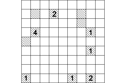 W niektórych jasnych kratkach diagramu należy umieścić 12 obserwatorów (narysować kółka) tak, aby: - cyfra w ciemnej kratce określa, na ilu polach, stykających się z tą kratką bokiem, mogą znaleźć się obserwatorzy, - żaden z obserwatorów nie może widzieć innego, - jeden obserwator może być określony przez dwa pola z cyframi, - każde jasne pole było widziane przynajmniej przez jednego z nich.