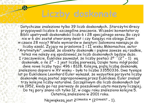 Liczby towarzyskie I. Definicja i przykłady Skończoną grupę liczb nazywamy grupą liczb towarzyskich, gdy tworzą one cykl liczb o następującej własności: suma wszystkich dzielników właściwych pierwszej liczby jest równa drugiej liczbie; suma wszystkich właściwych dzielników drugiej liczby jest równa trzeciej liczbie i tak dalej, aż do n-tej liczby, której suma wszystkich dzielników właściwych jest równa pierwszej liczbie. Ilość liczb towarzyskich w grupie nazywa się rzędem liczb towarzyskich. Przykładem liczby towarzyskiej pierwszego rzędu jest liczba 6. Przyjmijmy następujące oznaczenie: Dn – Zbiór dzielników liczby n. Wówczas D6 = {1; 2; 3} i 1+2+3=6. Takie liczby, których suma jej wszystkich właściwych dzielników jest równa tej liczbie nazywamy liczbami doskonałymi. Inaczej – liczby doskonałe, to liczby towarzyskie pierwszego rzędu. Przykładem liczb towarzyskich drugiego rzędu jest para 220 i 284. D220={1; 2; 4; 5; 10; 11; 20; 22; 44; 55; 110} i 1+2+4+5+10+11+20+22+44+55+110=284 oraz D284={1; 2; 4; 71; 142} i 1+2+4+71+142=220 Liczby towarzyskie drugiego rzędu nazywamy liczbami zaprzyjaźnionymi. Jak do tej pory, nie są znane liczby towarzyskie rzędu trzeciego. Przykładem liczb towarzyskich rzędu czwartego jest zbiór liczb {1264460; 1547860; 1727636; 1305184} D1264460={1; 2; 4; 5; 10; 17; 20; 34; 68; 85; 170; 340; 3719; 7438; 14876; 18595; 37190; 63223; 74380; 126446; 252892; 316115; 632230} i 1+2+4+5+10+17+20+34+68+85+170+340+3719+7438+ +14876+18595+37190+63223+74380+126446+252892+ +316115+632230=1547860 oraz D1547860={1; 2; 4; 5; 10; 20; 193; 386; 401; 772; 802; 965; 1604; 1930; 2005; 3860; 4010; 8020; 77393; 154786; 309572; 386965; 773930} i 1+2+4+5+10+20+193+386+401+772+802+965+1604+ +1930+2005+3860+4010+8020+77393+154786+309572+ +386965+773930=1727636 oraz D1727636={1; 2; 4; 521; 829; 1042; 1658; 2084; 3316; 431909; 863818} i 1+2+4+521+829+1042+1658+2084+3316+431909+863818= =1305184 oraz D1305184={1; 2; 4; 8; 16; 32; 40787; 81574; 163148; 326296; 652592} i 1+2+4+8+16+32+40787+81574+163148+326296+652592= =1264460. Pierwszą taką sekwencję liczb znalazł belgijski matematyk Paul Poulet (1887 – 1946) w roku 1918 i to on nazwał taki łańcuch liczbami towarzyskimi. II. Liczby doskonałe. Liczby doskonałe to takie, których suma wszystkich dzielników właściwych jest równa tej liczbie. Najmniejsze liczby doskonałe to 6 i 28. 6; bo D6={1; 2;3} i 1+2+3=6 28; bo D28={1; 2; 4; 7; 14} i 1+2+4+7+14=28 |