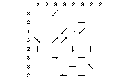 W niektórych polach diagramu umieszczone są niespodzianki (po jednej w każdym polu). Liczby przy brzegu diagramu wskazują, ile niespodzianek jest w danym rzędzie czy kolumnie. Ponadto każda strzałka wskazuje w kierunku przynajmniej jednej niespodzianki. Za pomocą kółeczek oznacz pola z niespodziankami. Uwaga: nie ma niespodzianek w polach ze strzałkami.